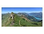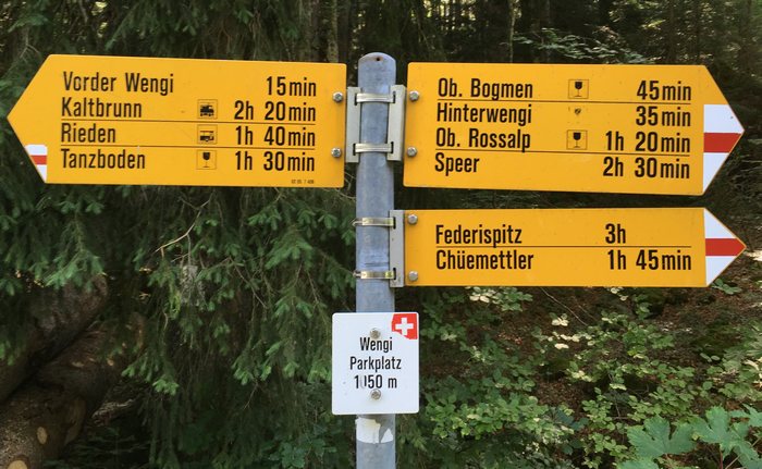Die gelbe Route startet mit einem leichten Anstieg ab dem Parkplatz im Wald hinauf und wir erreichen nach ca. 30 min Hinterwengi. Von dort geht es ganz moderat weiter bis zum Furggli. Vom Furggli aus müssen wir zum Hof in Trüebsiten absteigen. Nun geht es nur ganz wenig bergauf bis wir quasi um den Federispitz herum sind. Vor uns zeigt sich ein tolles Panarama mit Blick auf den Zürichsee. Nachdem wir die Hütte in Ober Federi passiert haben steigt der Weg steil an und führt uns direkt auf den Federigrat, von wo aus wir bereits den Gipfel sehen.